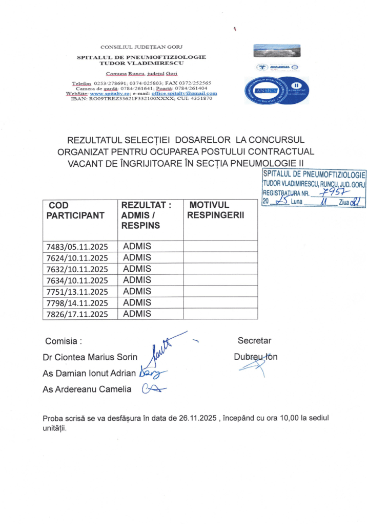 Rezultate selecție dosare concurs îngrijitoare secția pneumologie II