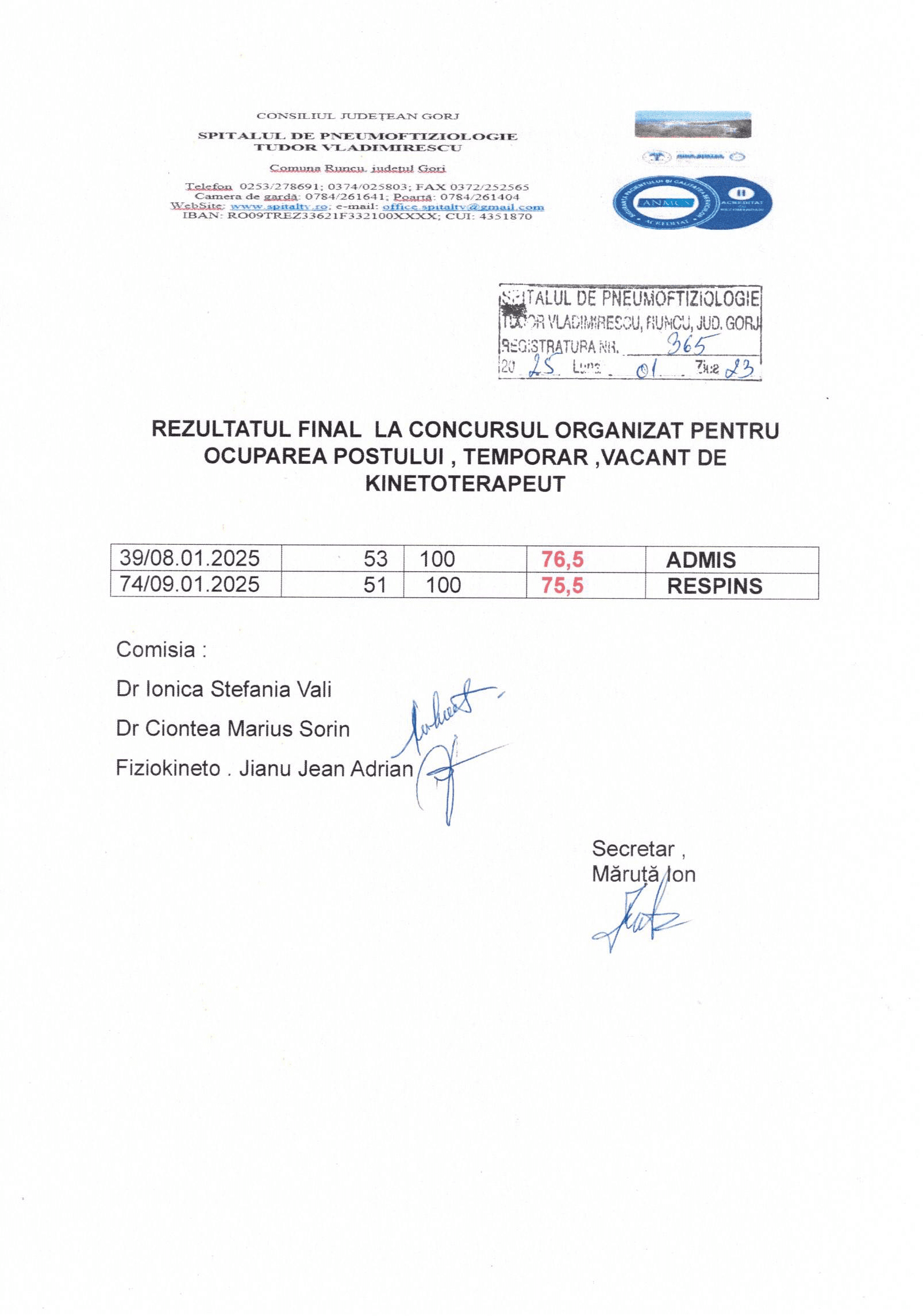 REZULTATUL FINAL LA CONCURSUL DE OCUPARE A UNUI POST TEMPORAR DE KINETOTERAPEUT